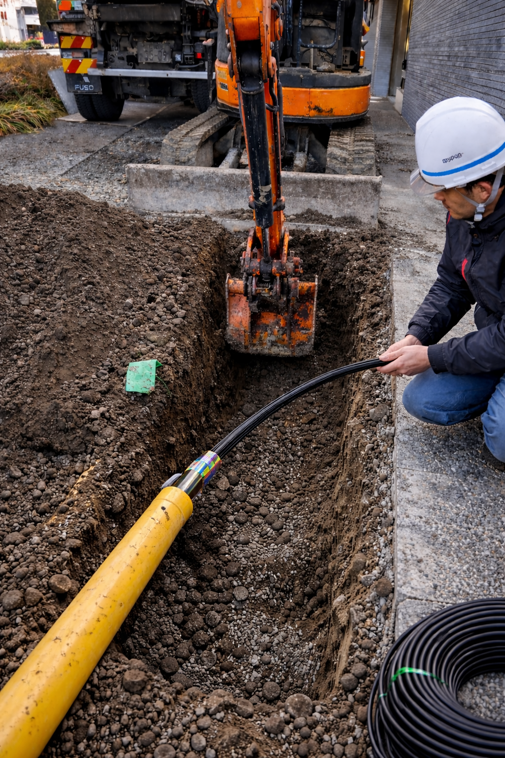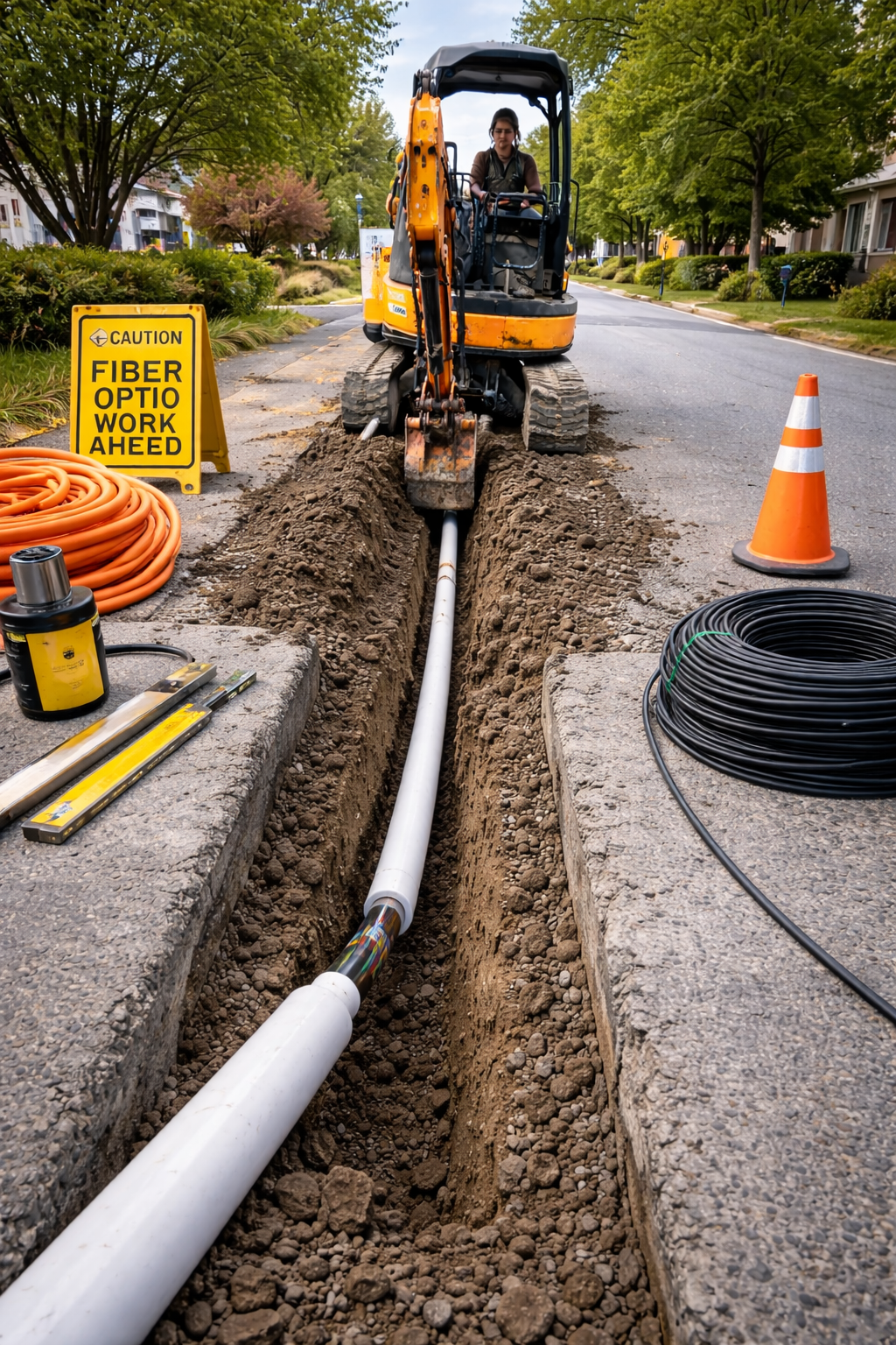 Controlled trench alignment ensuring conduit protection and system integrity.